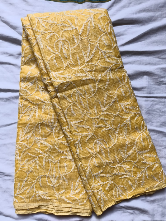 Yellow Mul Cotton saree with blue aplique and Chikankari