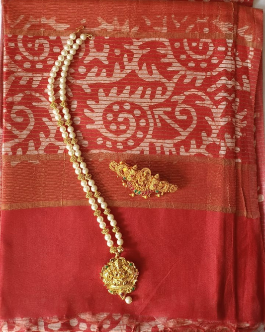 Red Geecha silk - Batik Screen Print (handmade) saree