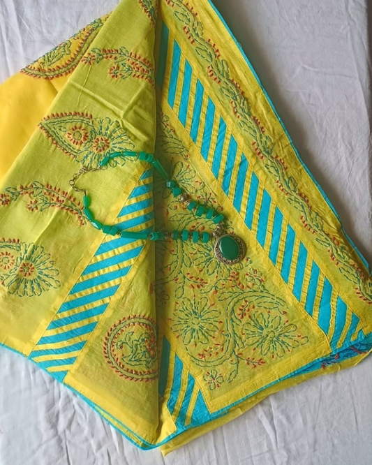 Yellow Mul Cotton saree with blue aplique and Chikankari