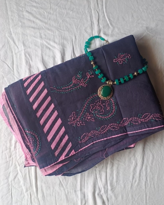 Dark Blue Mul Cotton saree with aplique and Chikankari