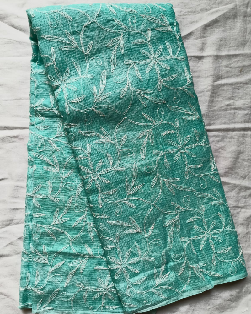 Blue Tepchi Chikankari Kota Cotton Saree. Handcrafted soft kota cotton. No attached blouse.