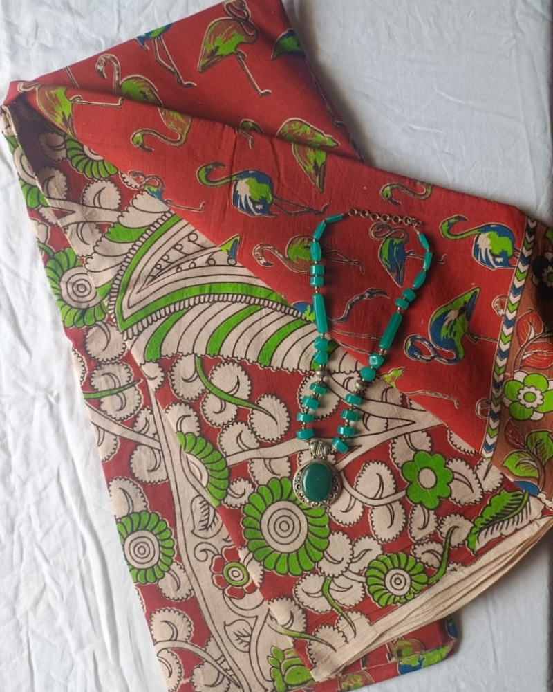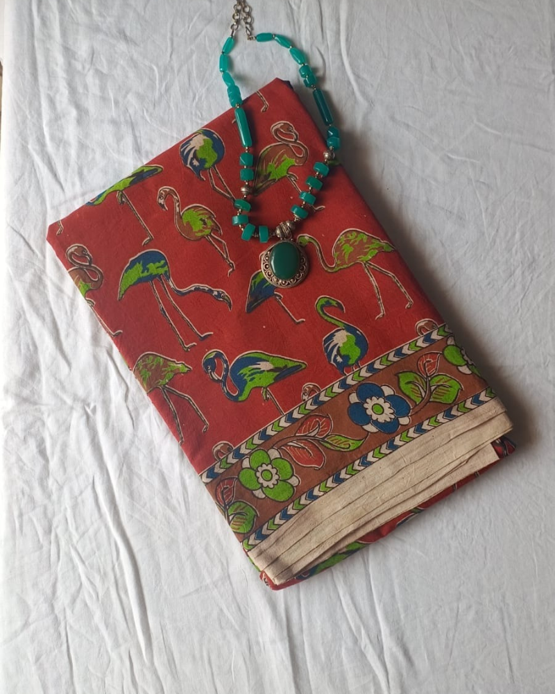 This cotton saree features a unique flamingo block print all over, with a stunning kalamkari peacock print on the pallu. Made from Mangalgiri cotton, this saree is lightweight, comfortable, and perfect for any occasion. Elevate your ethnic look with this beautiful and high-quality saree.