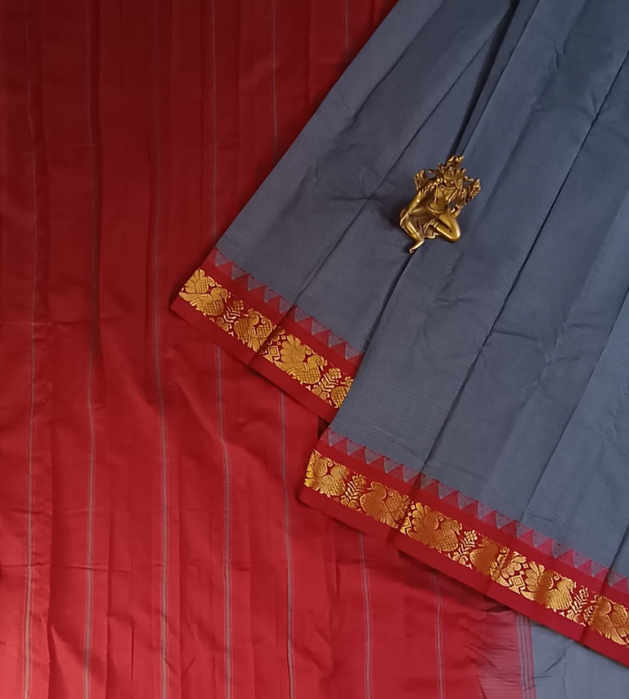 This Grey Gadwal Handloom Cotton Saree features a stunning contrast red Kanchi style temple border adorned with zari peacocks. The simple pallu adds a touch of elegance to the saree. Perfect for any occasion, this saree is made from high-quality handloom cotton for a comfortable and stylish wear.