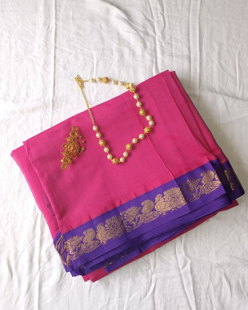 This Bright Pink Gadwal Handloom Cotton Saree features a stunning contrast purple Kanchi style border adorned with zari peacocks. The simple pallu adds a touch of elegance to the saree. Perfect for any occasion, this saree is made from high-quality handloom cotton for a comfortable and stylish wear.