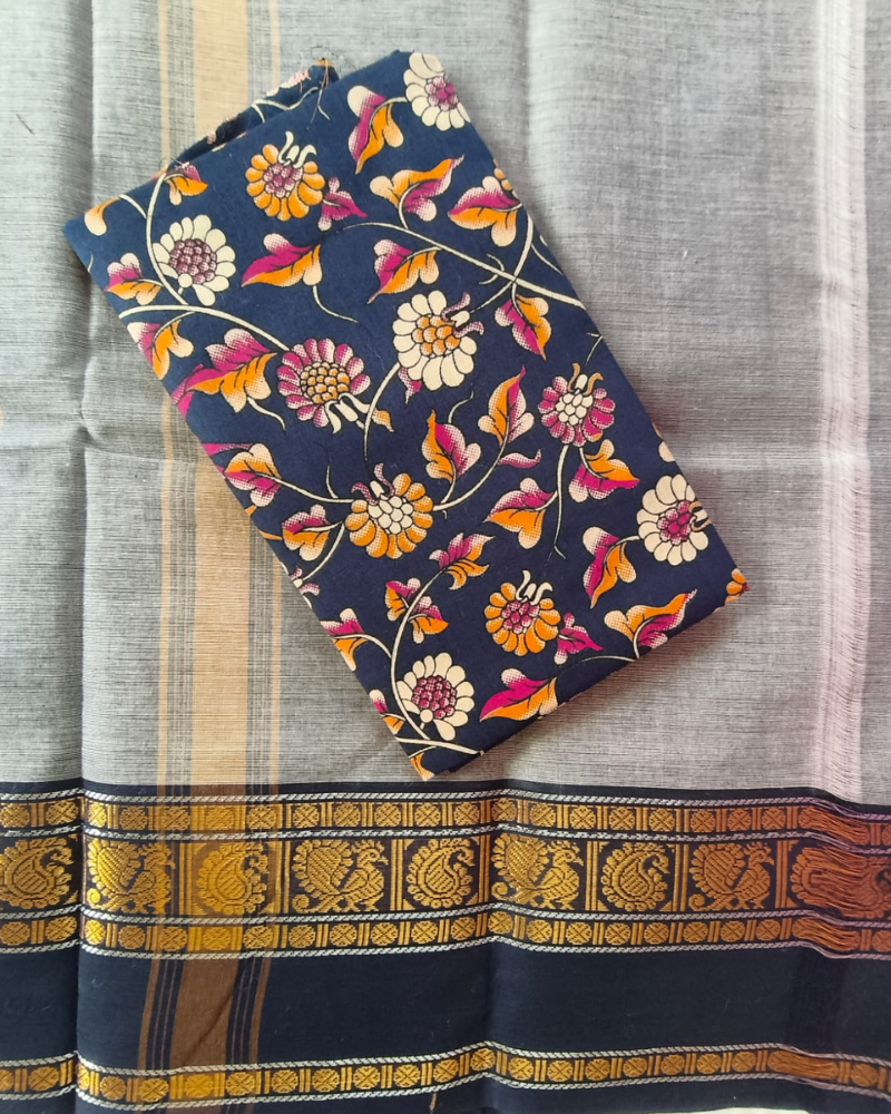 Elevate your festive wardrobe with this exquisite Grey Chattinad handloom cotton saree, crafted with meticulous attention to traditional weaving techniques. The saree features a striking dark blue Kanchi-style border that creates a sophisticated contrast against the soft grey base, while an ornate zari border adds timeless elegance. This ensemble includes a coordinating 1-meter contrast printed cotton blouse piece, offering versatility for styling. The handloom construction ensures breathability and comfort, making it ideal for celebrations and special occasions. A refined choice for those who appreciate authentic South Indian textiles and artisanal craftsmanship.