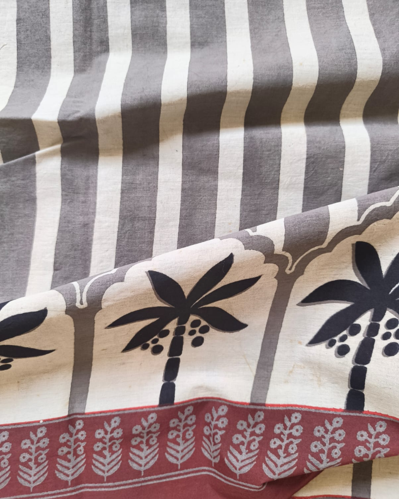 Grey & White Vanaspati Bagru Print Mul Cotton. With attached blouse.