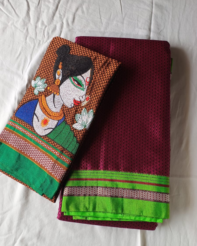 The saree is made of Khun fabric, which is known for its slightly coarse texture and intricate woven patterns. The body of the saree is a Maroon shade, features a green border with accents of gold and a patterned design with extra Designer contrast 1 meter Khun Blouse. Pallu is weaved with pure silk thread.