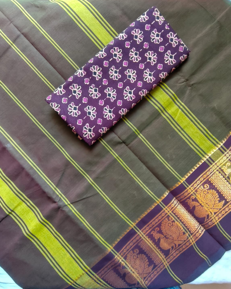 Mehandi Green Chattinad Handloom Cotton saree featuring a striking contrast Kanchi border that elevates its traditional appeal. This authentic handloom piece comes unstitched, paired with 1 meter of coordinating contrast printed blouse cotton fabric for seamless customization. The rich mehandi green hue combined with the intricate Chattinad weave creates an understated elegance perfect for festive occasions and temple visits. Handwoven with premium cotton, this saree offers breathability and comfort while maintaining the structural integrity characteristic of Chattinad textiles. Ideal for those seeking genuine handloom craftsmanship with practical versatility.