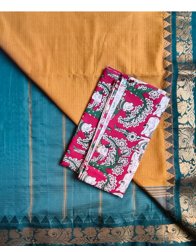 Elevate your traditional wardrobe with this authentic Gadwal handloom cotton saree. Featuring a striking green contrast Kanchi border that adds classical elegance. The vibrant color combination celebrates timeless South Indian textile artistry, making it an ideal choice for festive occasions and formal wear. Crafted from pure cotton, it offers breathability and comfort while maintaining the structured drape characteristic of Gadwal weaves. Perfect for tailoring a sophisticated blouse that complements traditional sarees beautifully.