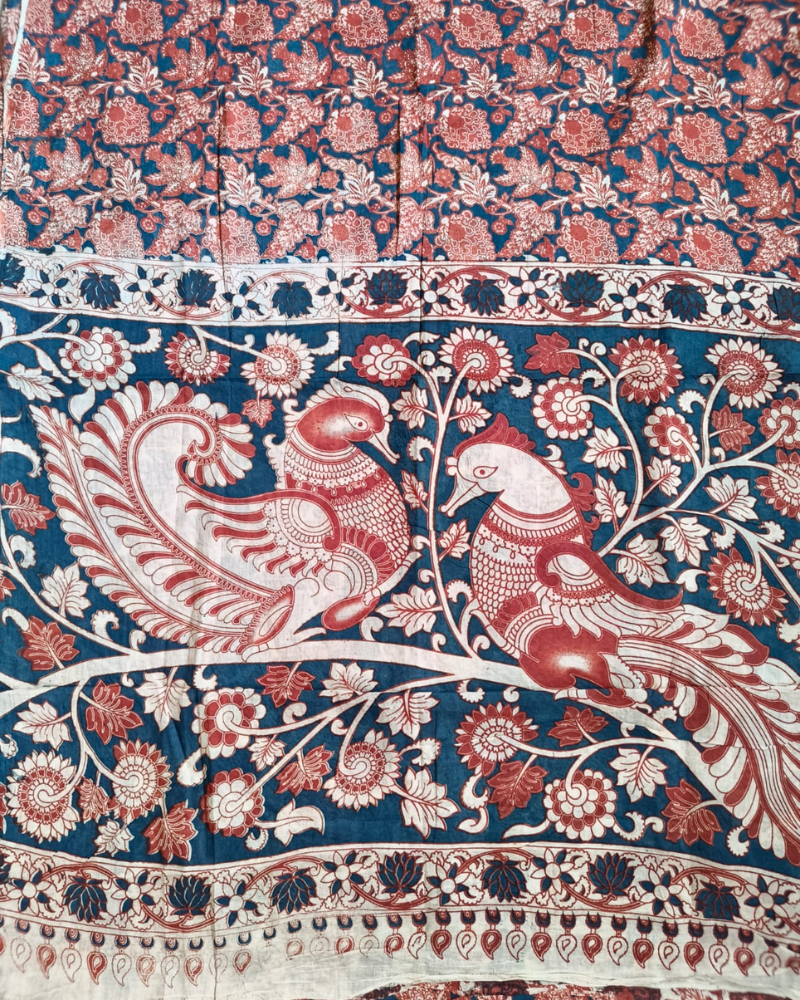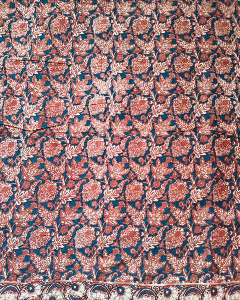 Red & Black Mul Cotton saree with screen printed patterns using natural dyes. Floral Jaal pattern all over. With attached blouse.